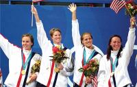 Jenny Thompson, second from right, and the team that won gold in the 4x100m freestyle relays at the 2000 Olympics in Sydney, Australia.